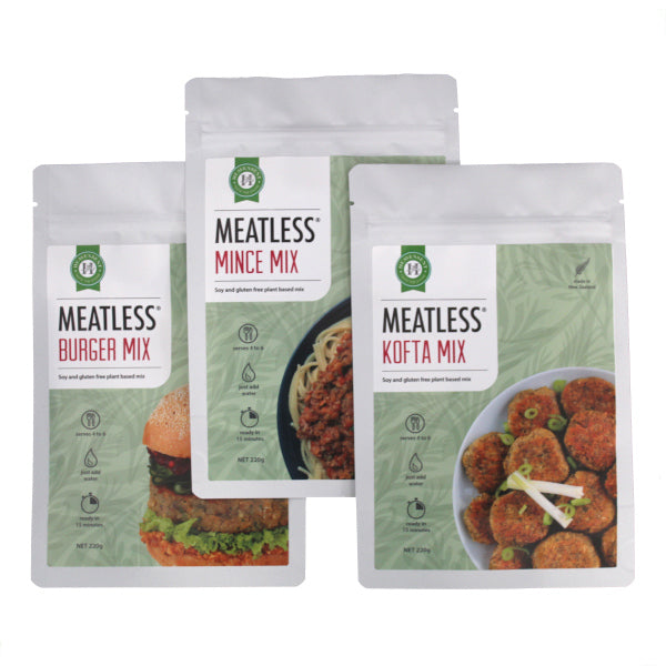 Four Pack - Taster of Meatless® mixes. One of each: Mince Mix, Kofta Mix, Burger Mix and Lentil Roast.
